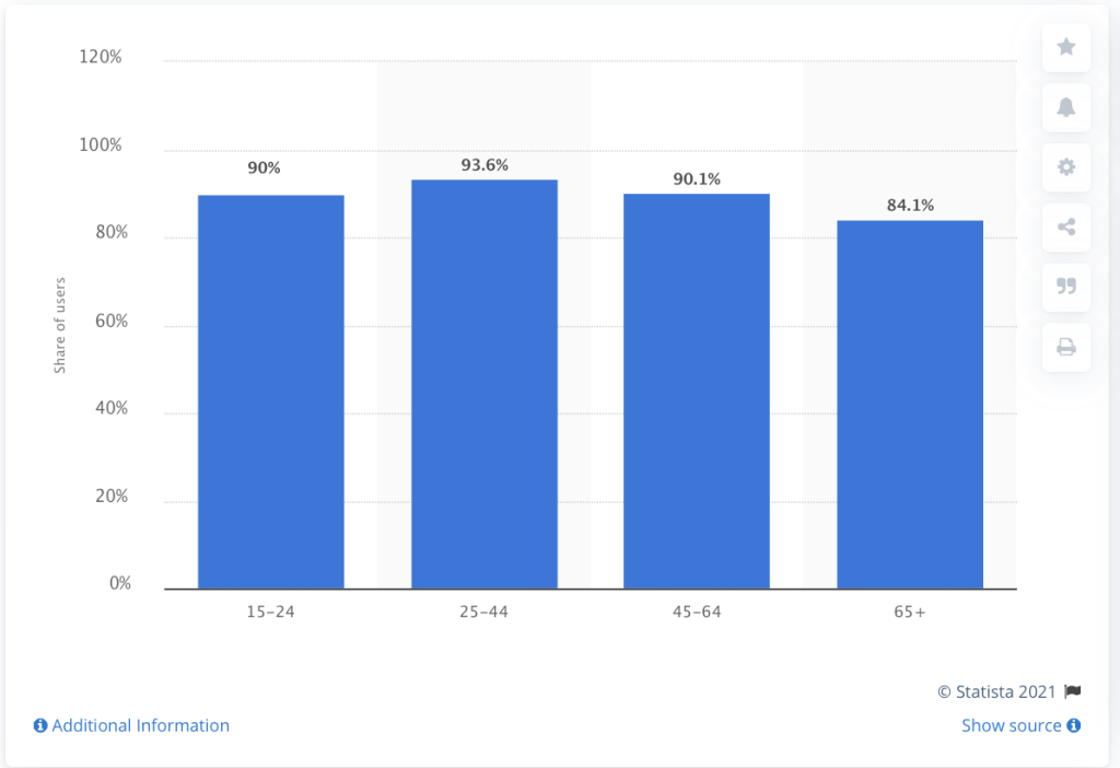 Email usage is widespread across all age groups in the United States, with only a slight decline among consumers in the 65+ age group. It is still one of the most widely-used tools for digital communication, among both businesses and consumers.