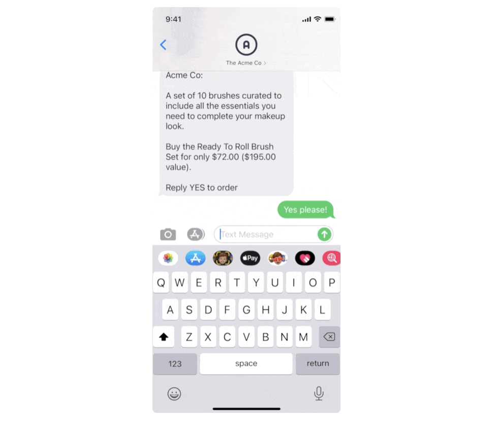 Just as it sounds, “reply to buy” means that you can send a customer a text message promoting a product and all they have to do is respond with “yes” or the number of units they’d like to buy. It’s about as simple as it can get, with almost none of the usual speed bumps that customers run into on ecommerce checkouts.